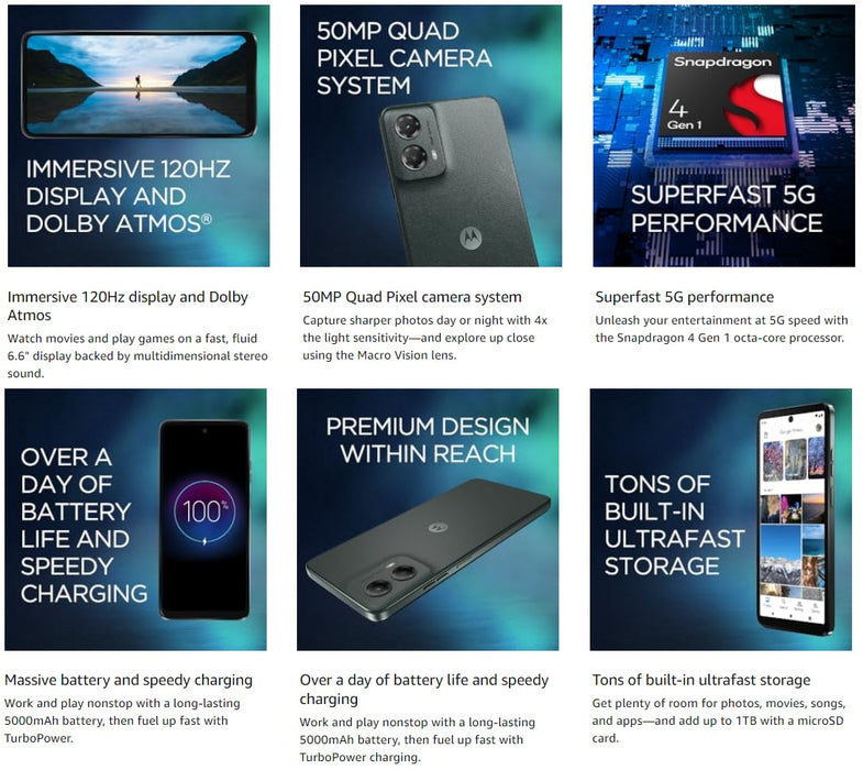 - 6.6" HD+ 1612x 720, 269ppi, LCD, 120Hz refresh rate, 21.5:9 Aspect Ratio, 5000mAh Battery, Android 14
